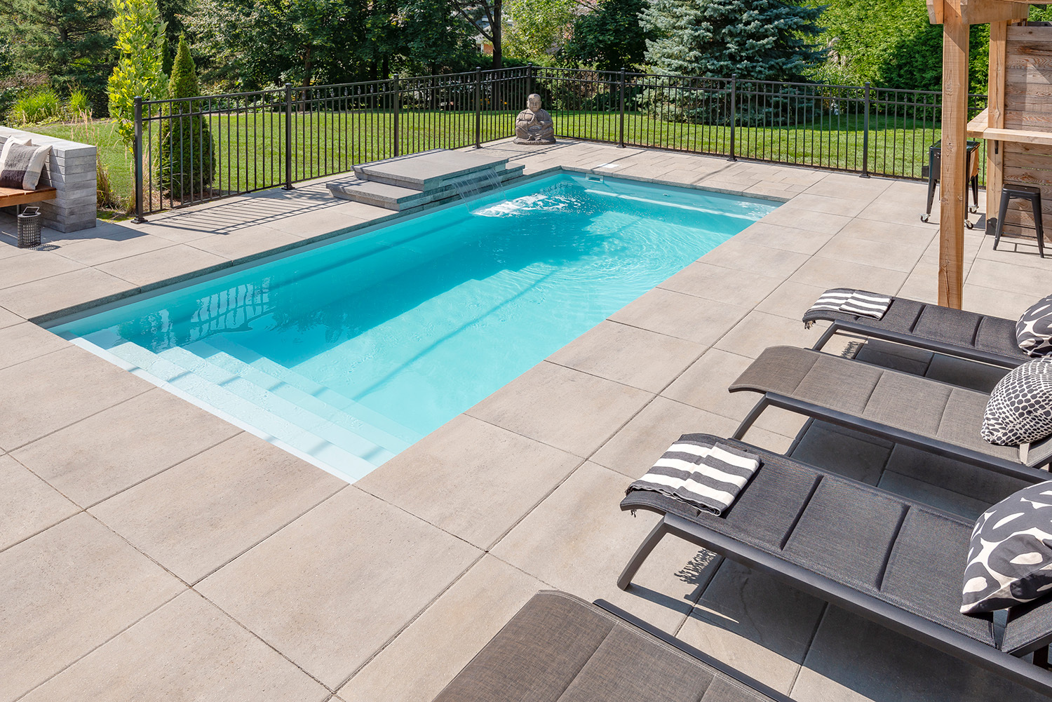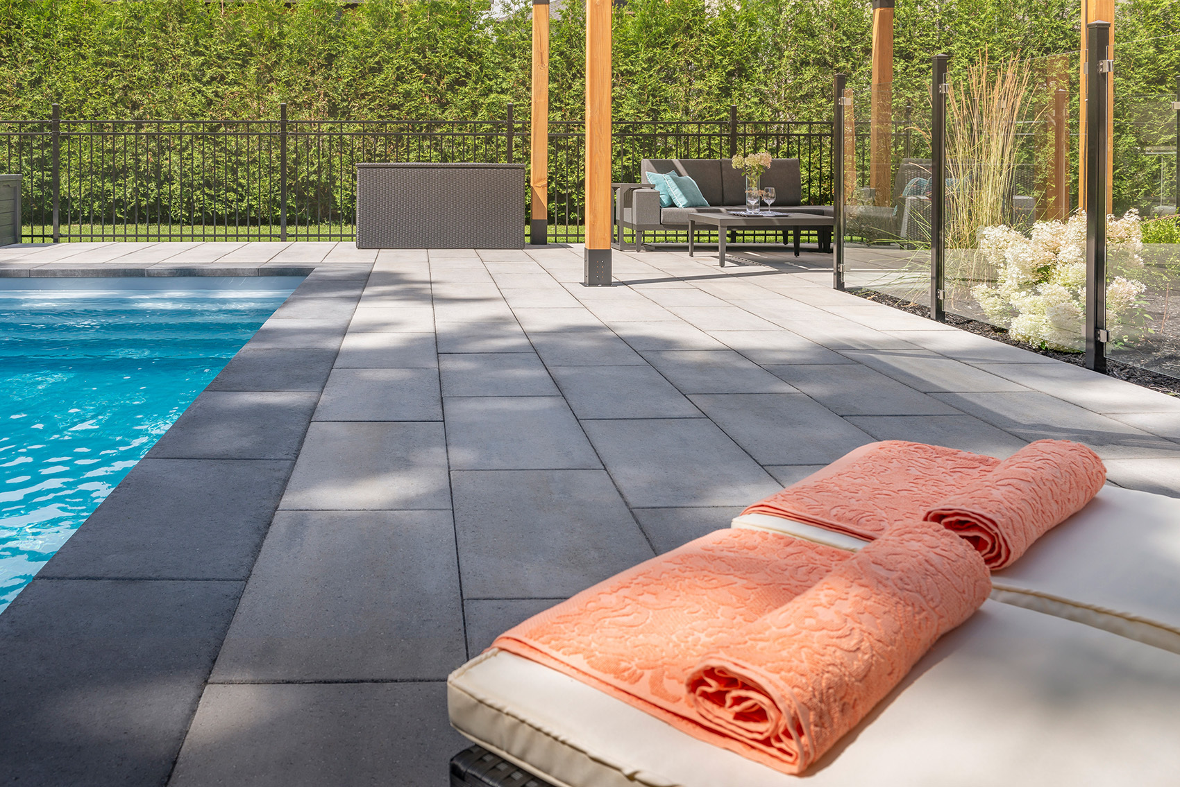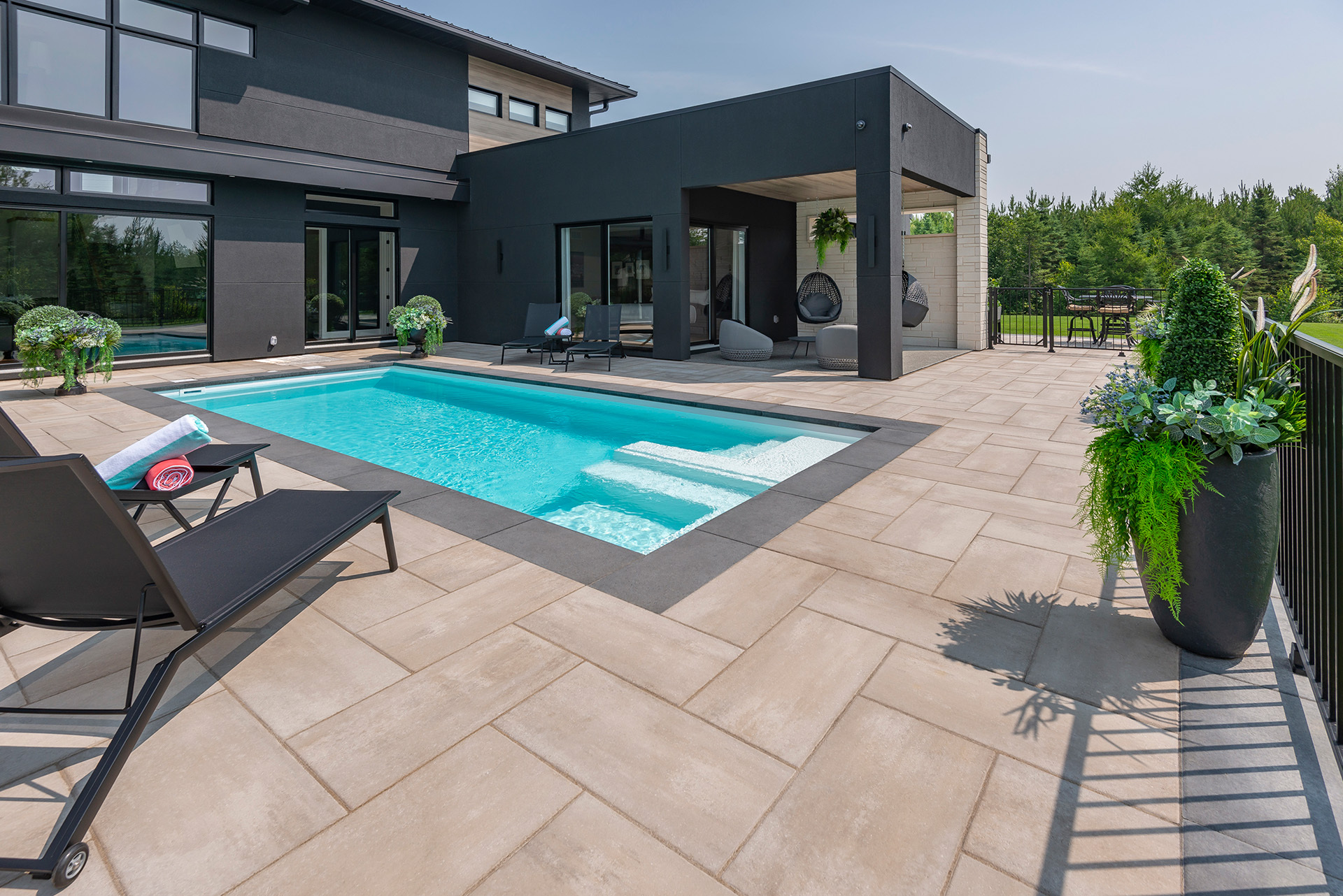 For a zen and modern ambiance that complements your pool, opt for tiles with a smooth and straight finish. Depending on the color of the pool, choose a tile color that fits well with a modern and minimalist look, such as gray or white. Rinox offers options that help you achieve a minimalist style around your pool. When selecting the installation with your installer, request a linear layout for a guaranteed sleek look.