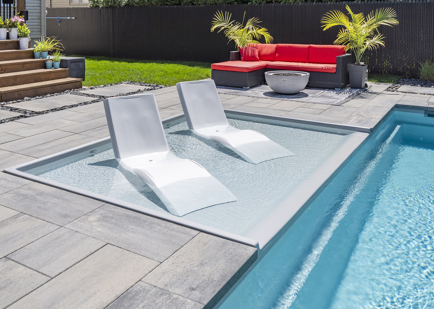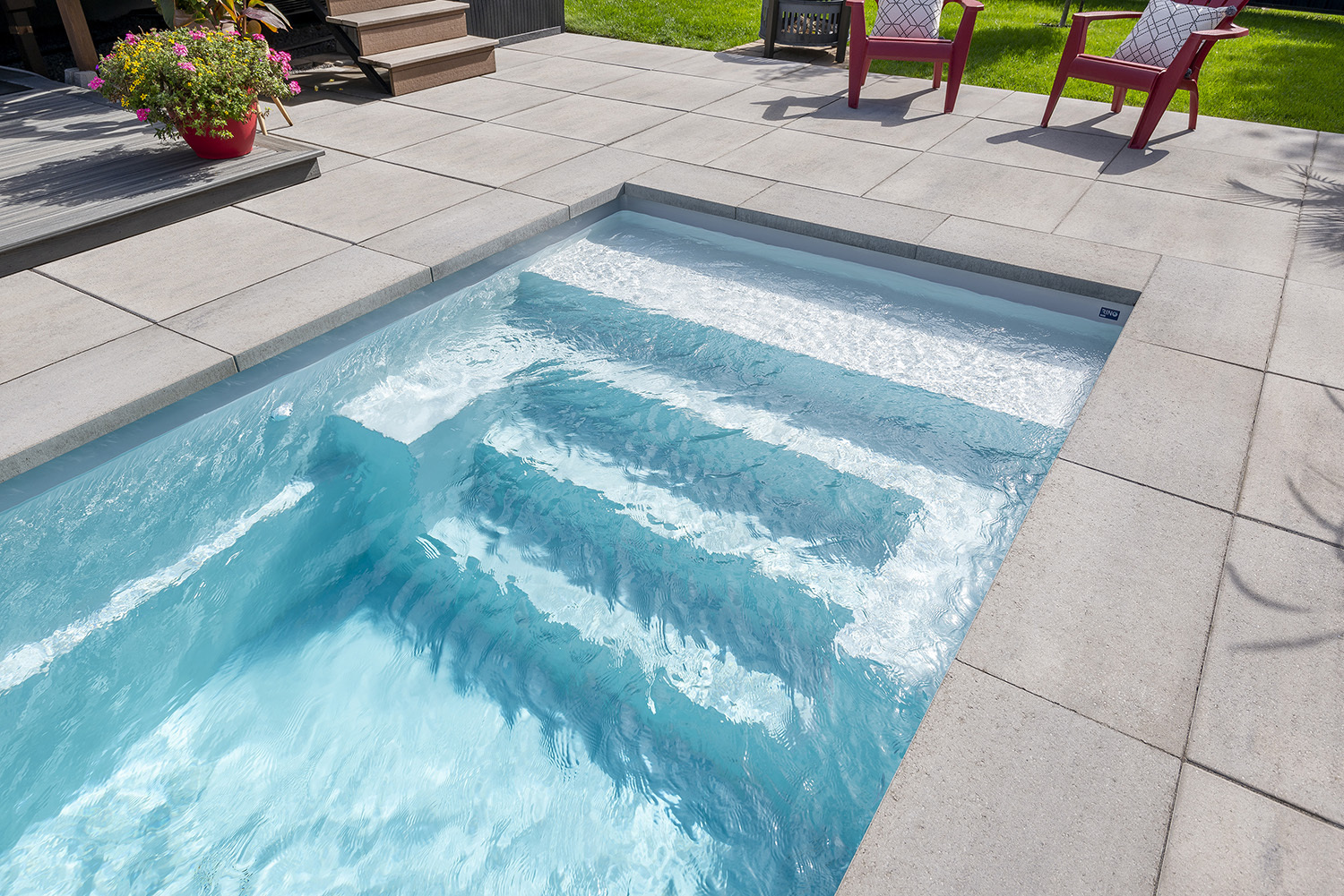 Inspired by a clean, harmonious style, these fiberglass pools integrate beautifully into well-landscaped yards. Spacious yet ergonomic, they feature therapeutic steps—perfect for gently preserving mobility.