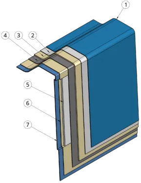 1. Gel Coating 2. Vinylester Protective Barrier 3. Fiber And Resin Spray 4. Woven Fiberglass Structural Layer 5. Sectional Reinforcements 6. Fiber And Resin Spray 7. Azoria Closure Membrane